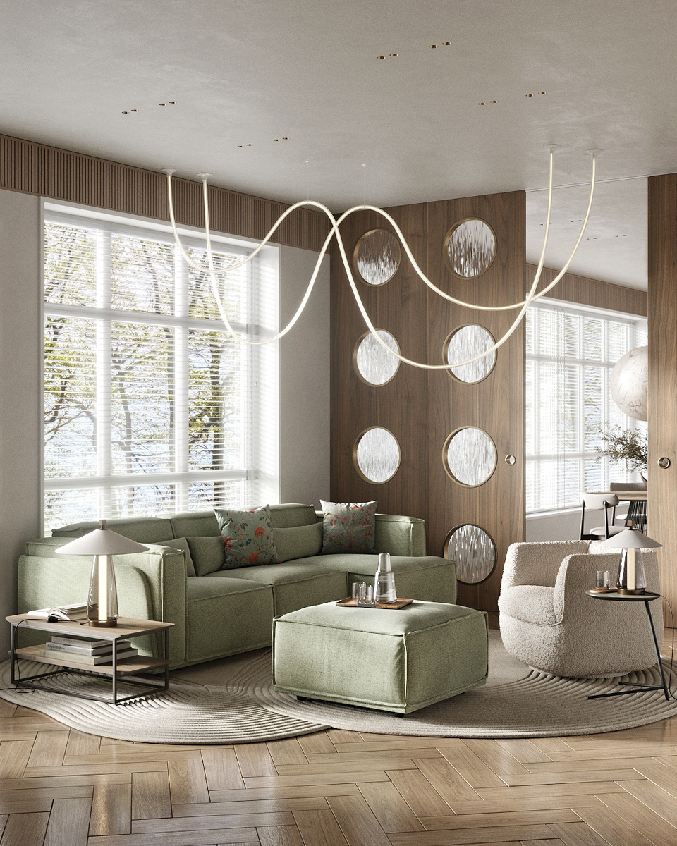 Когда дело доходит до выбора мебели в гостиную, руки опускаются. Так хочется найти современную, стильную мебель, которую быстро бы доставили, а вокруг одна классика, да еще и низкого качества. А ведь именно здесь собирается вся семья — пространство гостиной должно быть особенно «своим». Предлагаем немного освежить мысли и вдохновиться лаконичными проектами гостиной. Вся мебель в подборке из коллекции SKDESIGN — стильные предметы интерьера и декора в современной эстетике. Эстетика скандинавского модерна. Сдвижная перегородка с акцентной круглой перфорацией сохранит воздушность пространства. В противовес ей — лаконичные кубические формы дивана Vento. Всё это в гармонии светлых оттенков и шпона теплого тона. В пару к дивану выбрали кресло Spin в обивке из мягкой и текстурной ткани букле. Сочетание светло-зеленого материала дивана и молочного оттенка кресла поддерживают общее настроение этого "воздушного" пространства. Незаменимыми деталями служат журнальные столики. В коллекции диванов Bl