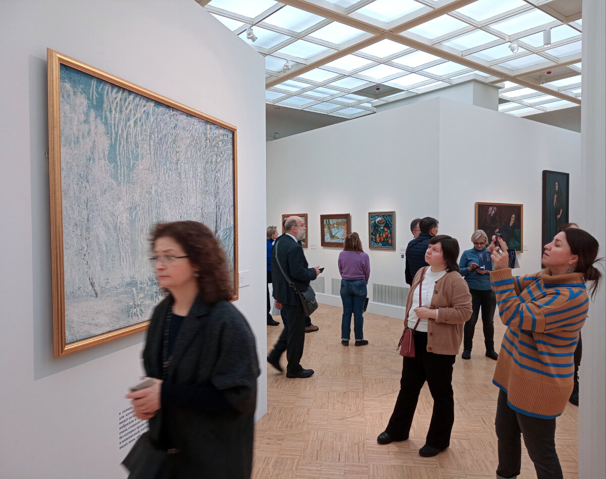 В классическом музее, какой бы ты не был оригинальный и чудной, вынужден вести себя подобающе. Это в современных арт-пространствах публика порой всеми способами заявляет о себе, а классика, наоборот, заставляет, так сказать, "притушиться", прибрать своё "Я" и уступить место искусству. Здесь не осмелишься даже громко разговаривать, а мышкой будешь шушукаться со своим товарищем, осторожно ступать и даже телефон сделаешь тихим. Культурные места уравнивают и объединяют - все пришли что-то общее изучить, оценить, понять. Такие разные, мы тянемся к одному и тому же, например, в Третьяковской галерее на выставке к 150-летию художника Игоря Грабаря. Вот девушка в чёрном, с какими-то тайными серебряными знаками на шее, в огромных ботинках с прослойками железа (я с нежностью изучаю её образ - моей юности "привет") рассматривает нарядные берёзки в снегу. А вот пожилая пара, взявшись за руки (приятно посмотреть!), просит их сфотографировать: "Снимите нас, молодых!". Ну а вот и мы с братом. Синхр
