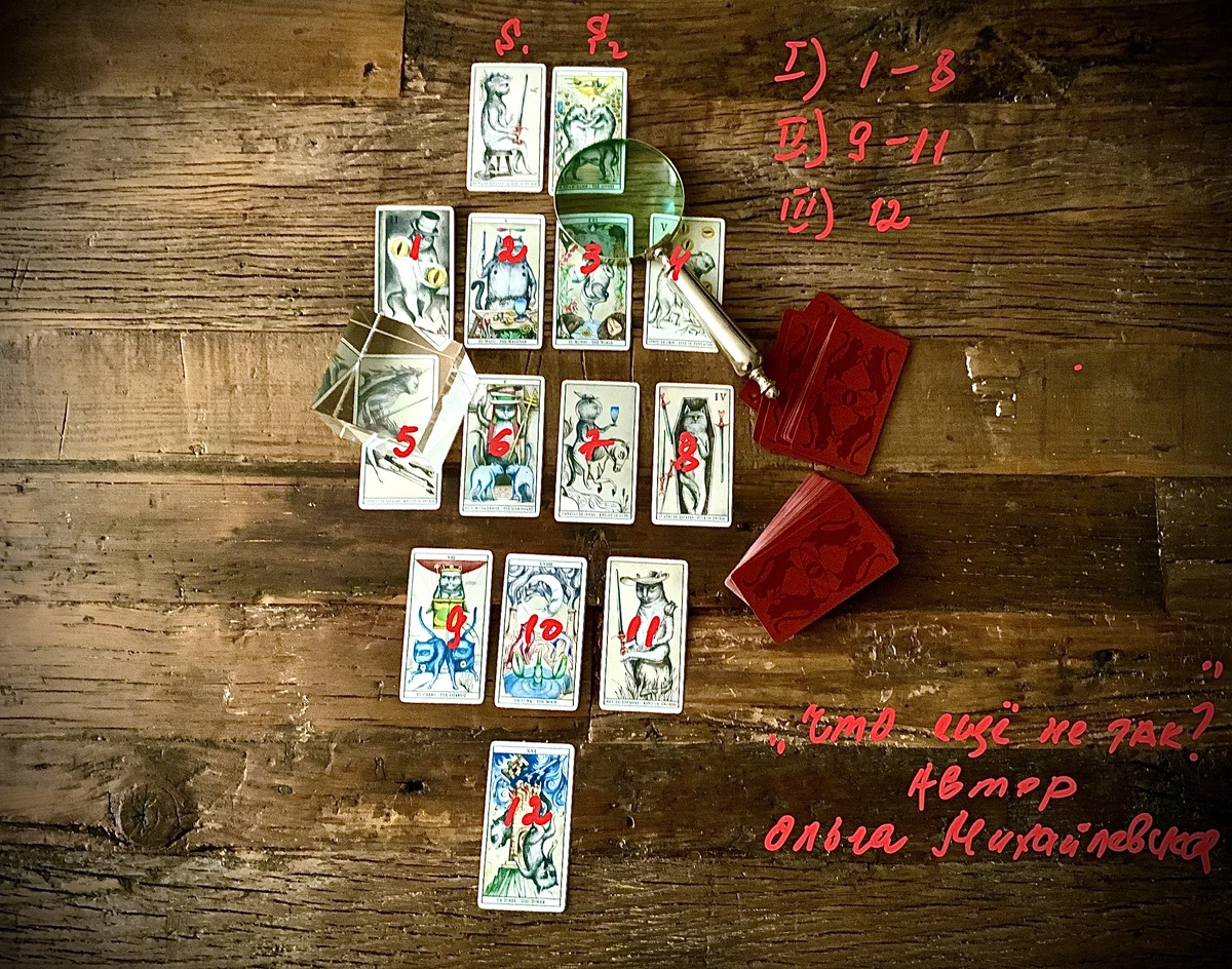 В дополнение к серии моих публикаций на эту же тему: мой расклад. Позиции можно добавлять или убавлять, зависит от вопроса. Например, вас волнует мнение его мамы конкретно, или что думают его коллеги и что завистливые бабы из бухгалтерии вдувают ему в уши относительно вашего характера. Прямо такие позиции и добавляете в первую группу вопросов. РАСКЛАД «ЧТО ЕЩЕ НЕ ТАК?» Автор Ольга Михайлевская . S1 - S2 Сигнификаторы Кверента и его Партнера I) Что не нравится, что раздражает Партнера в личности Кверента: 1. Внешность 2. Интеллект 3. Образование 4. Статус 5. Характер 6. Семейные/национальные/религиозные традиции (можно раскрыть пол номерами 6.1; 6.2 и так далее) 7. Имидж (одежда, макияж, стиль) 8. Сексуальная совместимость (темперамент, поведение, привычки). II) Действия, осознание Кверентом этих проблем 9. Может ли Кверент исправить нужные положения? 10. А стоит ли исправлять что-то ради Партнера? 11. Не влияет ли на мнение Партера его окружение (семья, коллеги, друзья