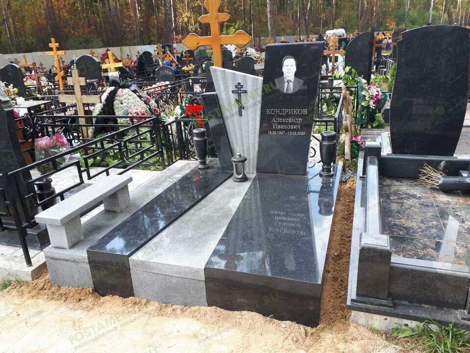 Комбинированный мемориальный комплекс изготовлен мастерами компании Постамент из чёрного, карельского камня - Габбро-Диабаз и серого гранита - Цветок Урала. Срок изготовления один месяц. Комплекс установлен на Новолюберецком кладбище. Высокое надгробие выполнено в западноевропейском стиле. Чередующиеся асимметричные серые и чёрные полосы выглядят очень эффектно. Вставки отличаются не только по цвету, но и по высоте, образуя чёткую разделительную границу между составными деталями. Есть отличия и по фактуре: зеркальная полировка Габбро, контрастирует с матовой, пиленой поверхностью уральского гранита. Серая стела имеет волнистую поверхность, в виде лучей, созданных на фрезерном станке с ЧПУ. Портрет и надписи на чёрном фоне выполнены при помощи автоматизированного лазерного гравера пятого поколения, с ЧПУ. В компании Постамент можно заказать изготовление мемориального комплекса, памятника на могилу, с установкой в Москве или МО, по телефону или с помощью выездного менеджера. При необ