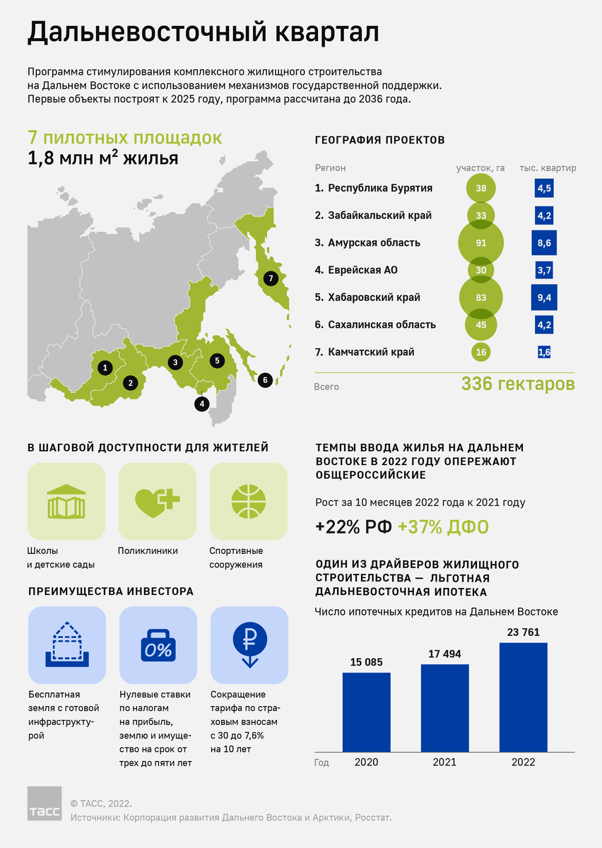 Завершен прием документов на первые конкурсы по выбору застройщиков в рамках программы "Дальневосточный квартал", которая была разработана в 2021 году Минвостокразвития РФ и КРДВ для поддержки проектов масштабной застройки в городах Дальневосточного федерального округа. Программа, в частности, нацелена на создание нового уровня комфортной городской среды и формирование условий для обеспечения жителей новым жильем по справедливой цене. О пилотных регионах реализации программы, плюсах для инвесторов и жителей - в инфографике ТАСС.
