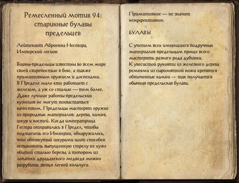 Если в чем предельские ремесленники и могут тягаться с мастерами цивилизованных народов Тамриэля, так это в изготовлении изделий из кожи. Почти все предметы одежды воинов Предела выполняют сугубо практическую цель, но прочные кожаные пояса обычно служат своим владельцам много лет. Обычно они украшены стилизованными изображениями зверей, которых почитает владелец, - чаще всего медведей, оленей, волков и воронов.