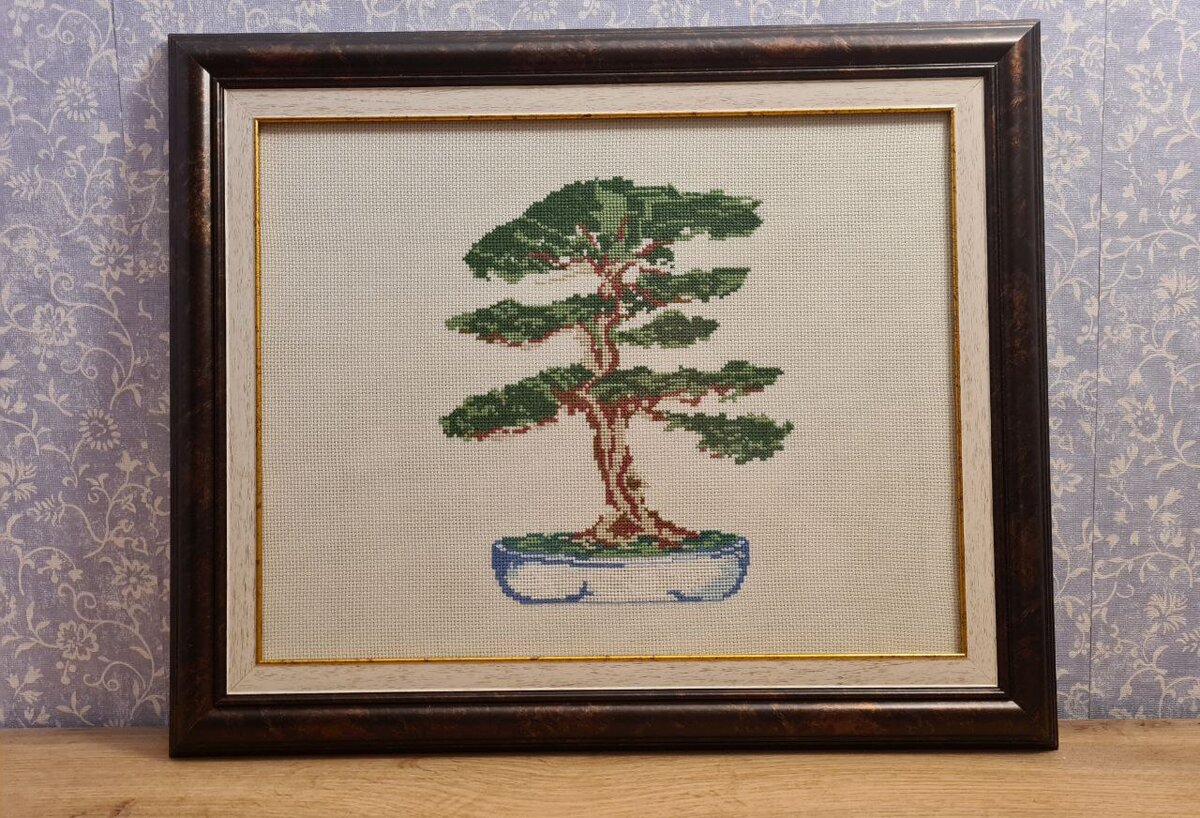 Не думала я, что закончу бонсай в скором времени. Но под Новый год случаются чудеса и вот моя работа передо мной. Почему именно бонсай? Мне очень импонирует это искусство. И, кстати, я долгое время думала, что оно зародилось в Японии. Но это не так. Стиль бонсай появился в Китае и в Японию попал в 6 веке. Поиски подобного набора или схемы заняли у меня, наверное, полгода. В конце концов я нашла несколько схем на Pinterest и выбрала самую интересную. Потом закупилась нитками и канвой в маленьком магазинчике. Это было моей ошибкой. Кажется, что нитки DMC были, мягко говоря, не настоящими. Постоянно путались, а иногда и рвались. От канвы я тоже не в восторге. Начала работу летом прошлого года и большая часть была готова в августе-сентябре 2021. Кстати, от схемы я отошла и результатом своей самодеятельности довольна :) Это был мой первый опыт вышивки не из набора. Не могу сказать, что мне очень понравилось. Но я не откажусь повторить, если мне попадётся что- нибудь интересное