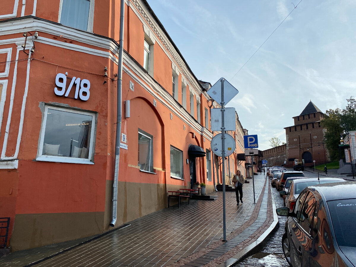 Начну с места с отличными завтраками. 9/18 — это номер дома на Ивановском съезде, в углу которого расположено бистро. Прямо под кремлем и рядом с бывшим ночлежным домом Бугрова, описанным Горьким в пьесе «На дне»; перед ночлежкой к 800-летию города воспроизвели надпись, которая раньше на ней красовалась: «Водки не пить. Песен не петь. Вести себя тихо».