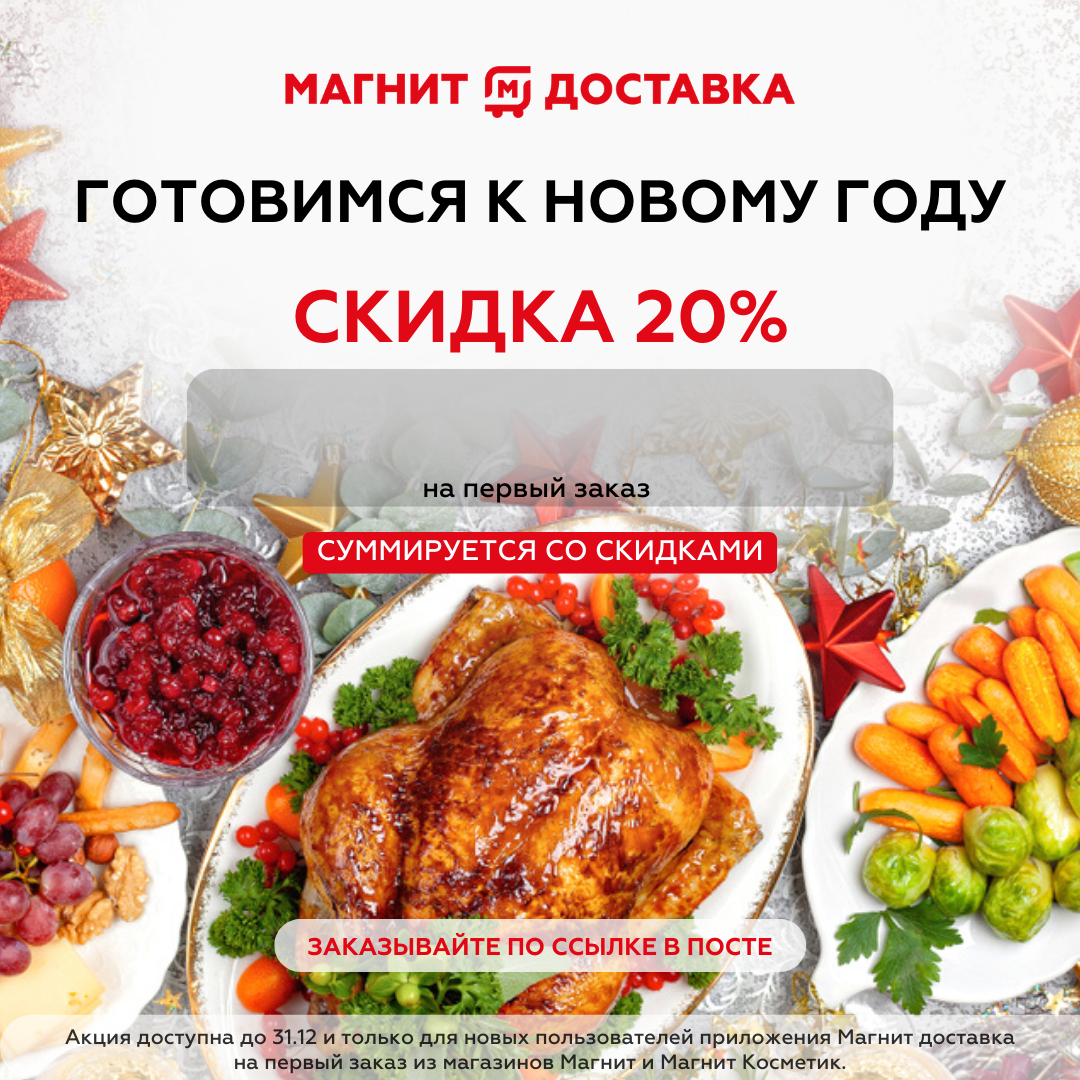 Лайфхак: новогоднее меню на 20% дешевле Как у вас проходит закупка продуктов для новогоднего меню? Многие покупают все в последний момент, забирая остатки с полок и, конечно, переплачивают. А ведь можно иначе: — не спеша установить приложение Магнит Доставка и сделать первый заказ на 20% дешевле; — получить выгоду за покупки: 2% бонусами на карту Магнит. 1 бонус = 1 рубль. А потом оплатить бонусами до 50% от суммы покупки в офлайн -магазинах; — заранее купить по скидке то, что спокойно полежит пару недель в холодильнике: горошек, кукурузу, яйца, майонез и т. д.. Не толкаться в очереди, не бояться микробов, не нервничать. Все просто! Чтобы получить 20% скидку устанавливайте приложение по ссылке _https://magnitdeli.prfl.me/601d1b3f43e112436f86cfc4/84ad43d327a4_, и не забудьте скопировать промокод _ WIN93410__. Выгодных покупок!🛍️