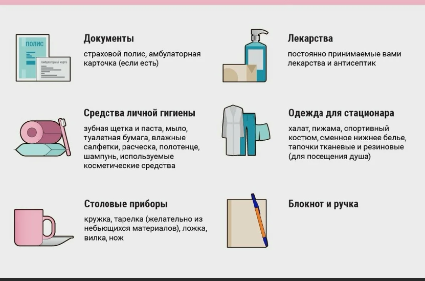Наступила зима - время простуд, высоких температур и пневмоний. Когда мы или нашие близкие серьёзно заболеваем и становится совсем плохо, то вызываем "Скорую помощь". И если фельдшер говорит, что необходима госпитализация, то это всегда стрессовая ситуация, в которой сложно сразу сообразить, какие вещи нужно собрать в больницу. Предлагаем примерный список вещей, которые нужно взять с собой в стационар. Распечатайте его или перепишите от руки и положите в аптечку. Почему в аптечку? Потому что, когда в доме больной человек, аптечка у нас всегда под рукой, значит и список будет рядом. Когда будете переписывать список, можете сразу подкорректировать его под себя, под свои требования, что-то добавить или убрать из списка. 1. Документы (паспорт, медицинский полис, СНИЛС) 2. Деньги (карточку и немного наличных). Буквально вчера в больничном магазинчике я покупала воду, можно было расплатиться на кассе или наличкой или переводом на карту, просто картой заплатить было нельзя. 3. Лекарства, кот