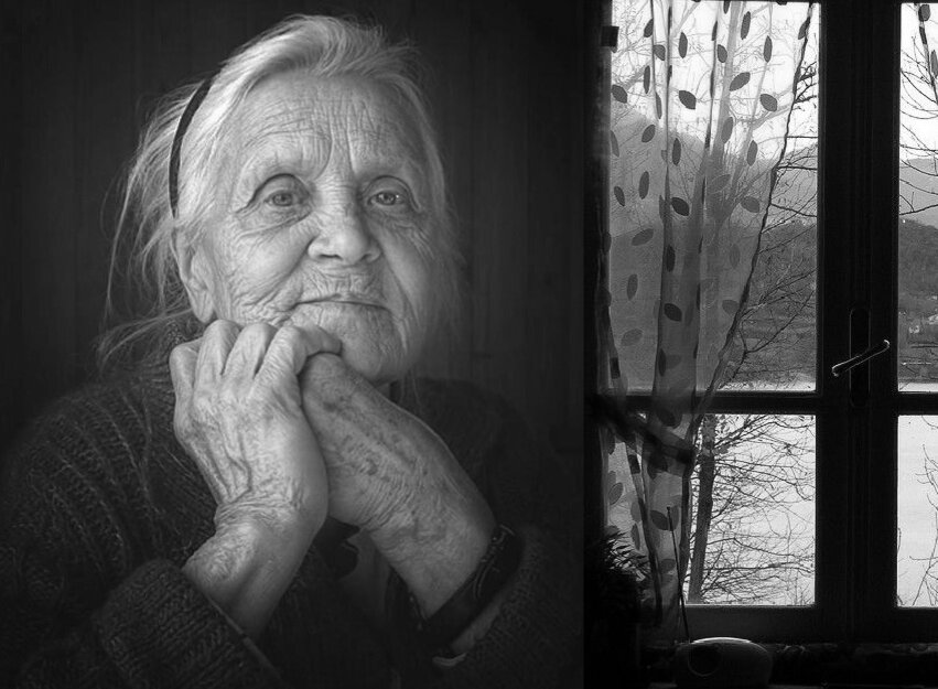 Пожилая женщина сидит у окна. Седые волосы убраны в скромную прическу, натруженные морщинистые руки сложены на коленях. В пустом доме тишина, только слышно, как тикает будильник.