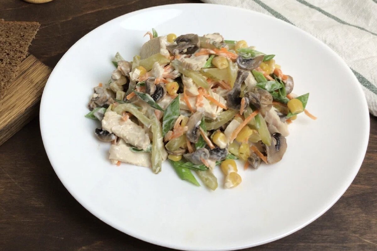 Здравствуйте, дорогие подписчики и гости моего канала. Каждая хозяйка когда составляет какой-то новый для себя салат, всегда боится, что какие-то ингредиенты могут быть несовместимы. Как мне кажется, что куриная грудка имеет нейтральный вкус и поэтому может так хорошо сочетаться со многими овощами и фруктами. Возможно поэтому мясо вообще входит практически во многие салаты, как основной ингредиент. Лично я не боюсь вообще экспериментировать в приготовлении салатов. Поэтому сегодня предлагаю вам три совершенно разных салата из куриной грудки. Салат из куриной грудки, грибов и кукурузы. Такой салат имеет простой состав и способ приготовления. Отличается нежным вкусом, без острых акцентов. Как я считаю, что такой салат отлично подходит в качестве закуски на праздничном застолье. Ингредиенты: • Куриная грудка-250 г • Грибы-150 г • Кукуруза-100 г • Морковь-100 г • Огурцы ( солёные)- 50 г • Зелень( лук)-1/2 пучка • Майонез-2 ст л Приготовление салата. Все ингредиенты нарезаем тонкой, длин