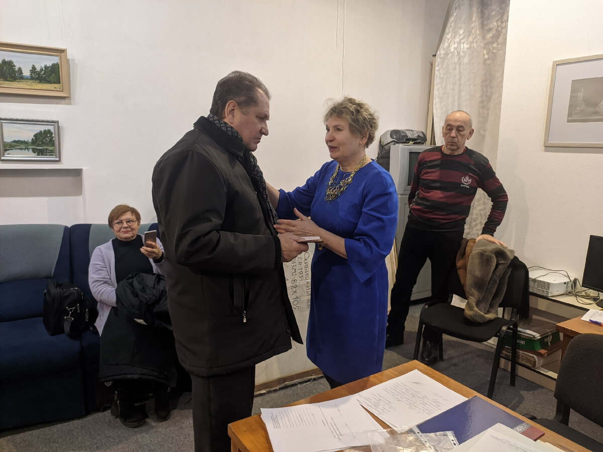 Марина Николаевна Рогатовская вручила С.Н. Кондрашову медаль СХ России «За верность искусству» со словами: «Рады приветствовать всех вас на открытии чудесной выставки светлого человека, который своим творчеством воплощает в искусстве наше время, нашу эпоху».