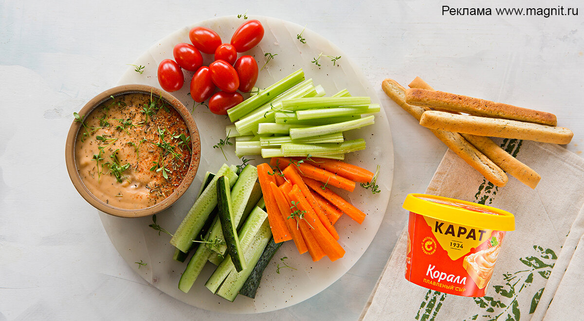 ❄️🎄 ИНГРЕДИЕНТЫ: 2 морковки 2 средних огурца 2 стебля сельдерея 150 г томатов черри 230 г плавленого сыра Коралл «Карат» 150 мл молока 2 ст. л. сливочного масла 2 ст. л. муки 1 ч. л. прованских трав 1 ч. л. лукового порошка ¼ ч. л. красного острого перца хлебцы для подачи ПОШАГОВОЕ ПРИГОТОВЛЕНИЕ Шаг 1. В сотейнике с толстым дном растопите сливочное масло. Добавьте муку и, тщательно перемешивая, готовьте 1–2 мин. Шаг 2. Аккуратно вливайте молоко небольшими порциями, каждый раз перемешивая до однородности. Доведите до кипения, приправьте травами, луковым порошком и острым перцем. Уменьшите огонь и добавьте сыр, перемешайте до полного растворения. Шаг 3. Сельдерей, огурец и морковь нарежьте брусочками. Подавайте соус с овощами и хлебцами. Время готовки - 10 мин Количество порций: 4–6 Количество калорий - 224 ккал БЖУ: 6 г / 13,1 г / 20,6 г Реклама. АО "Тандер". https://magnit.ru