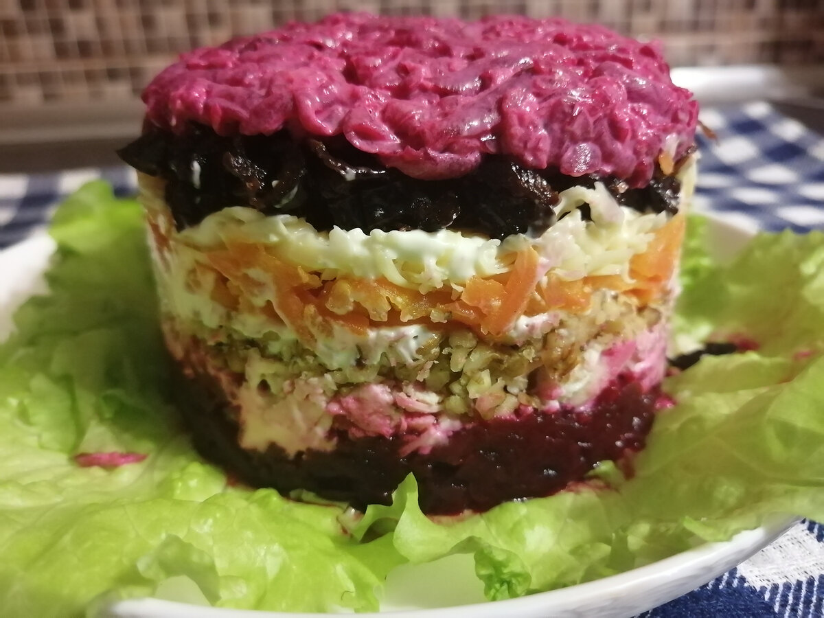 Всем доброго времени суток! Если Вы ещё в поиске, что подать на празничный стол, то рекомендую салат "Чингизхан". Ингредиенты: Свекла - 2 штуки или 1 большая Морковь-1 Курица-200 грамм Грецкие орехи-70 грамм Чернослив-70 грамм Сыр-80 грамм Чеснок-1 зубчик Майонез сколько потребуется. Приступим 1. Овощи отварить, остудить. Натереть на терке. Лишнюю жидкость отжать. 2. Курицу (грудку) отварить в соленой воде, остудить и нарезать мелким кубиком. 3. Орехи измельчить. 4. Чернослив залить на 10 минут горячей водой. Обсушить и мелко нарезать. 5. Сыр натереть на терке. Лучше мелкой. 6. Собираем салат. Можно в кольцо, можно просто на блюдо. Поливину натертой свеклы выкладываем 1 слоем. Немного посолить. Чуточку смазать майонезом. 2 слой-курица 3 слой-измельченные орехи (можно немного оставить для украшения) Майонез Далее слой моркови, а затем сыра. Майонез. Слой чернослива Теперь во вторую половину свеклы натераем 1 зубчик чеснока, немного посолить, добавить майонез, перемешать