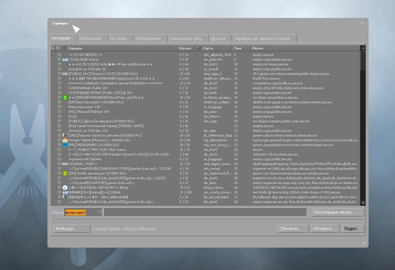 Разработчики добавили возможность владельцам серверов добавлять уникальные метки, с помощью которых игрок сразу сможет отсортировать сервера и найти подходящий. Установка меток на сервере осуществляется с помощью переменной sv_tags, ваши метки должны быть через запятую (пример sv_tags "128tick, deathmatch, doublejump"). Пример прописи списка меток в server.cfg и результат поиска по тегам в игре смотрите на рисунке 2.