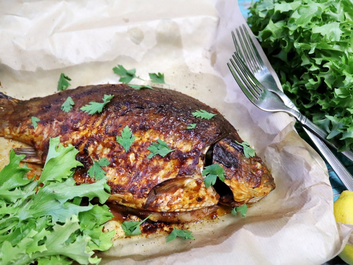 Разогреть духовку до 200 градусов. Запекать рыбу до румяной корочки минут 40-50, время зависит от размера рыбы. 6. Запеченый карсь готов.