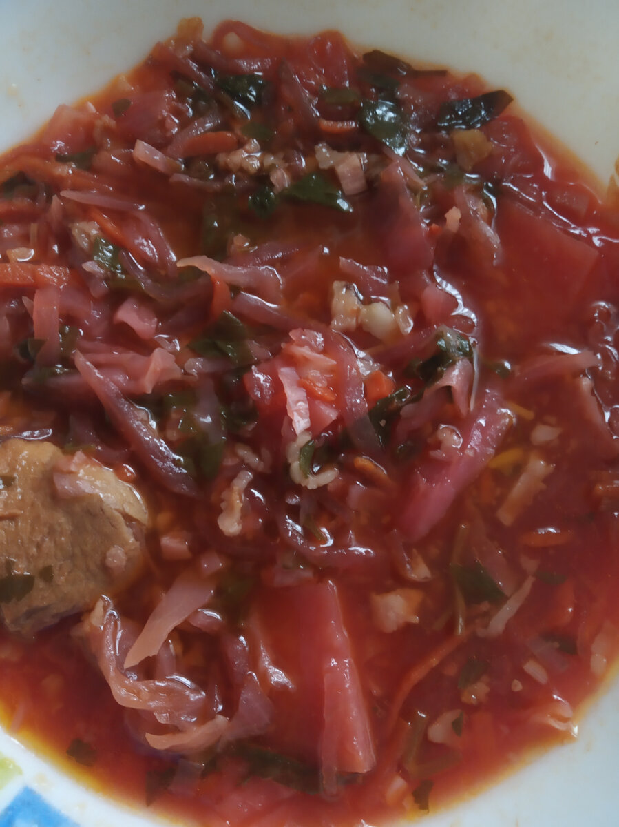 Неожиданно выяснилось, что борщ, который для меня прост и понятен, - блюдо очень спорное. И каждый, кто его готовит, уверен в правильности только своего привычного рецепта. Не стану переубеждать своих читателей. Но сразу подчеркну: никакого уксуса! Свекла не переваривается и цвет не теряет! Я теперь пошагово. Первым делом варим прозрачный бульон. Для меня борщ на курином - это неверно, но разве с вами, уверенными только в своей правоте, поспоришь! Потому перехожу к следующему шагу. Овощи. Оказывается, есть любительницы и без картошки варить. Почему, непонятно. Но я показываю классический вариант. И сразу подчеркиваю еще один момент: чеснок нужен только в том случае, если он еще и по старинному рецепту. Как моя бабушка готовила, о которой ранее в статье "Моя украинская бабушка, мой русский дедушка". Но тогда она не использовала мясной бульон. Получалось очень сытно, вкусно, дешево. И, так сказать, безотходное производство. Я же, когда в морозильнике завалялся кусочек свиной лопатки, нем