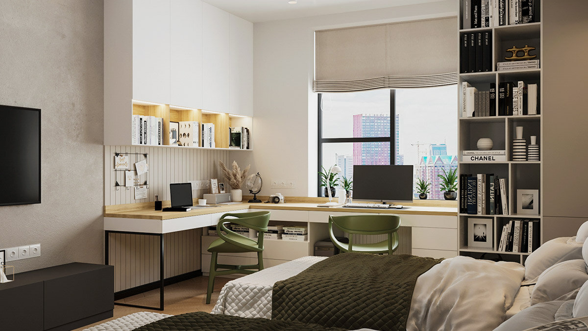 Конечно, полностью отказаться от размещения мебели у стен удается не всегда. Ключ к созданию интерьера, который не загроможденным – это выбор низкой мебели. Также стоит рассмотреть, действительно ли нам нужна вся мебель. Прежде всего, продумайте систему хранения вещей. Можно заказать индивидуальную застройку, когда встроенный шкаф-купе будет выполнять функцию гардеробной книжного стеллажа или в рабочей зоне можно разместить системы хранения под мини-диваном.