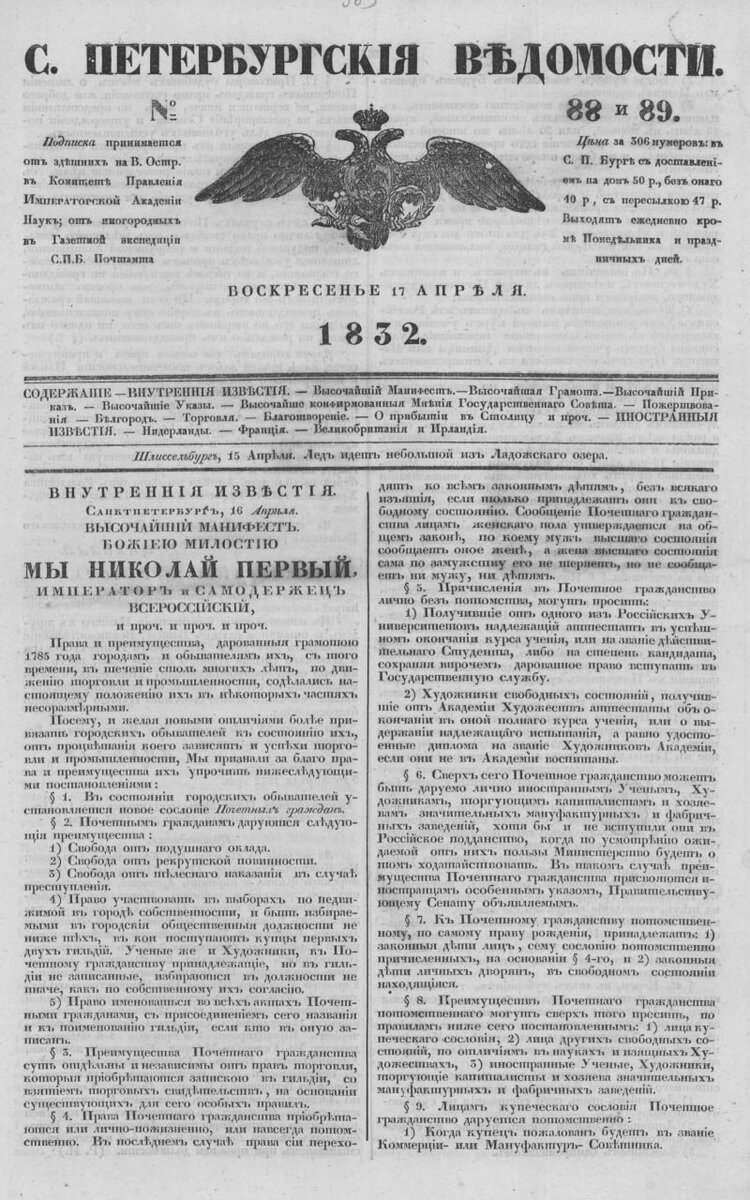 10(22) апреля 1832 года, Николай I подписал манифест об учреждении в России звания «почетный гражданин». Почётные граждане освобождались от рекрутской повинности, подушного оклада, телесных наказаний в случае совершения преступлений. Кроме того, они получили право избираться на городские общественные должности и ряд других преимуществ. Почётное гражданство было личным («лично-пожизненным») или потомственным. В последнем случае его получали все законные дети обладателя этого статуса.