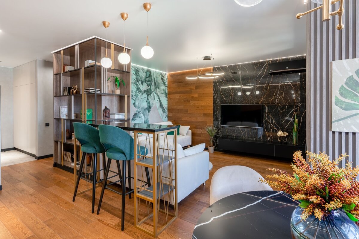 На этапе заполнения технического задания стало понятно, что заказчикам нравятся современные интерьеры с элементами латуни в декоре. Основными оттенками эксперты выбрали благородный темно-зеленый и насыщенный рыжий. В качестве акцентов — черные и золотые элементы.