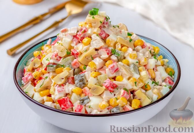 Дешевый салат из крабовых палочек наряду с оливье стал нашим любимцем. Постоянно готовлю его на праздничный стол