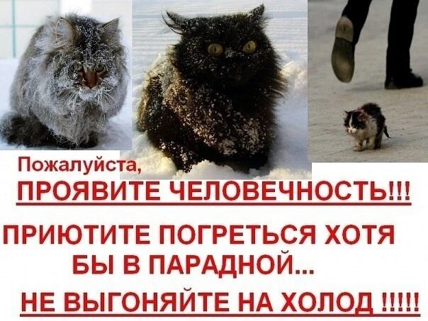 «Почему - то многих раздражают животные в подъездах. ‼️‼️‼️ Но в зимнее время смерть наступает не только от голода и переохлаждения, а, прежде всего, от того, что животным негде выспаться, негде восстановить силы. Нет тёплого места для сна. Они умирают от слабости, вследствие сильного недосыпа😭. Пожалуйста, 🙏не будьте бессердечными, не выгоняйте животных🐕🐈 из подъездов на холод , ведь они не занимают много места... 👆 Оказавшись в тепле, бездомные кошки или собаки ложатся и беспробудно спят в уголке по восемь - десять часов, свернувшись клубочком . А столкнувшись с человеческой жестокостью, бездомное животное, сгорбившись, с болью в глазах, уходит прочь... ‼️Оставайтесь, пожалуйста, людьми...»‼️🙏🙏💌