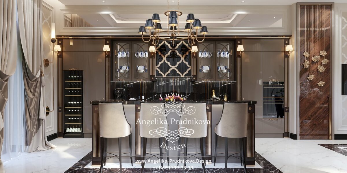 Интерьер на фото выглядит как эксклюзивный авторский десерт высокой кухни (Haute Cuisine). Светлая мраморная отделка напоминает воздушное суфле, фасады мебели — изысканный кофейный ликер, спинки барных стульев — кракелюры из застывшей карамели, мраморный фартук — двухцветный бисквит, а люстра с ворохом хрустальных подвесок — свежайшие взбитые сливки.