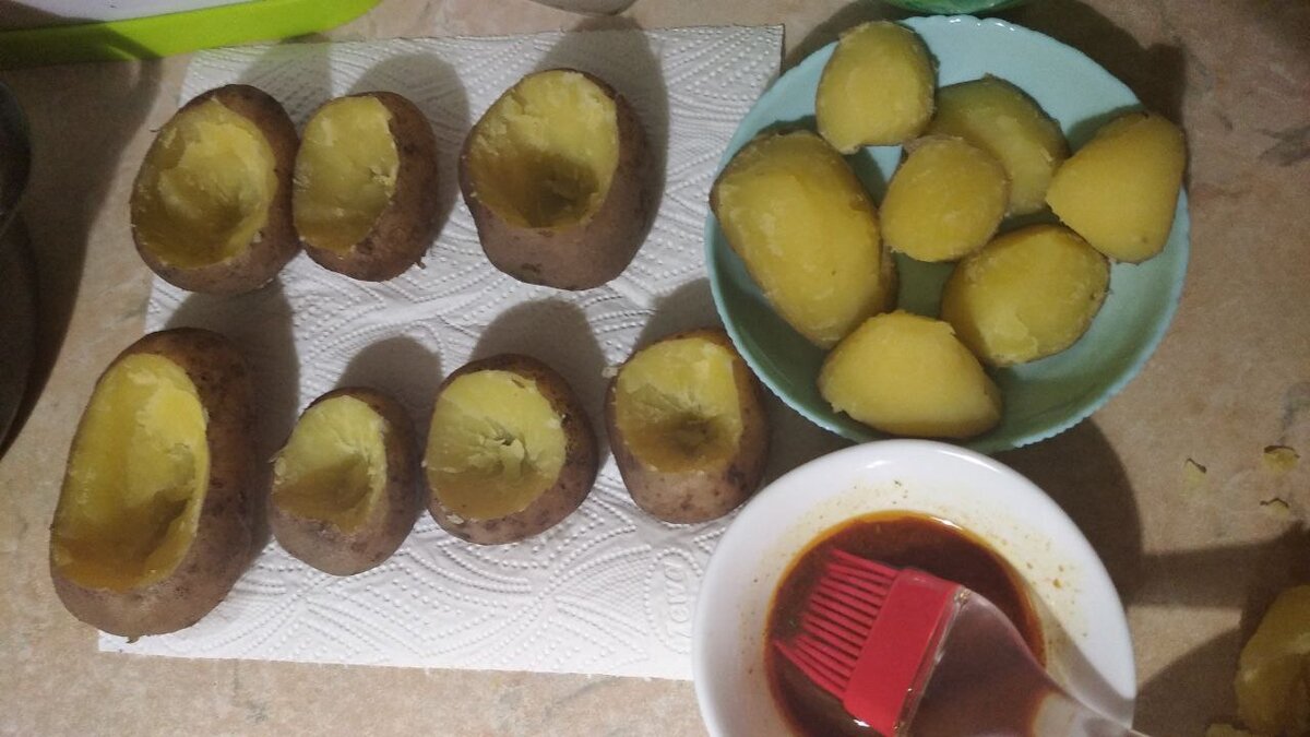 Сегодня решила побаловать себя и мужа картошечкой ! Удивились? Да да!! Картошка при диете разрешена!😀👍 Это полезное и низкокалорийное блюдо, если она сваренная в мундире или запечена в кожуре. При термической обработке кожура сохраняет все полезные вещества. Скажу еще, что и отварную картошку тоже можно кушать, но это уже не так вкусно. А вот почти всеми любимая жаренная картошка и картофель-фри - это табу!!!☝️ Теперь, что нам нужно для нашего блюда: - Отварной картофель, - Отварная курица, - Помидорчик или кетчуп( чуть-чуть для вкуса можно), - Сыр твердый, - Соус - соль, перец, паприка и чуть-чуть масла растительного - все перемешиваем. Зелень по желанию. Теперь как это всё сделать: Отвариваем картошечку в мундире до готовности. Остужаем, вырезаем сердцевину и затем ложкой делаем более ровное углубление для начинки. Это углубление смазываем нашим соусом. Затем в углубление клубня кладем мелко нарезанную курицу, затем капля кетчупа и посыпаем тёртым сыром! Выклады