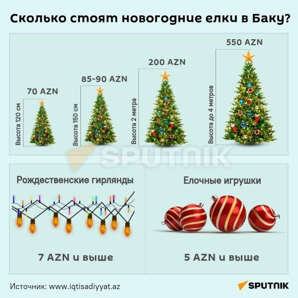 Какую сумму придется уплатить жителям азербайджанской столицы в предверии Нового года за главный праздничный атрибут и его украшения – в инфографике Sputnik Азербайджан. Жители Баку уже сейчас готовятся к Новому году – делают закупки для новогоднего стола, готовят презенты родным и близким, наряжают главный атрибут праздника – елку. Отметим, что в связи с наступающим Новым годом в ряде районов столицы организованы праздничные ярмарки, где можно купить все необходимое, в том числе и елку. Обычную елку можно приобрести в городе за сумму от 50 до 150 манатов, а настольная декоративная елка обойдется за пять манатов и выше. Если говорить непосредственно об украшениях, то гирлянды в зависимости от вида и цветов продаются в пределе семи манатов. Светодиодные гирлянды обойдутся в 30 манатов. Дешевые игрушки встречаются за 1,5 маната, средняя цена на них – около 5 манатов. На дорогие придется раскошелиться и заплатить 30 манатов.