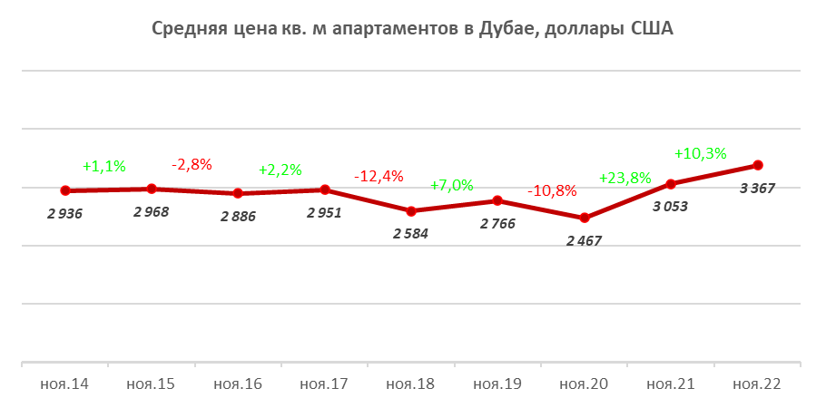 Вторичный рынок апартаментов Дубая более стабильный, чем рынок новостроек, цены здесь меньше подвержены колебаниям, так за последние 8 лет цены изменялись в пределах 2,5 – 3,4 тыс. долларов США. В период с 2014 по 2017 гг. цены на вторичном рынке были стабильны и колебались в пределах плюс-минус 1 – 3%, в 2018 году цены скорректировались вниз на 12,4%, часть этого снижения была отыграна в 2019 году. Основное снижение стоимости вторичного жилья отмечалось в период коронавирусных ограничений в ноябре 2020 года, далее, по мере снятия ограничений и нормализации ситуации, стоимость квартир на вторичке стала расти, в 2021 году рост составил 23,8%. За последний год цены на вторичном рынке Дубая выросли на 10,3% и достигли уровня 3,37 тыс. долларов США за кв. м., прирост к ноябрь 2014 года составил 14,7%.