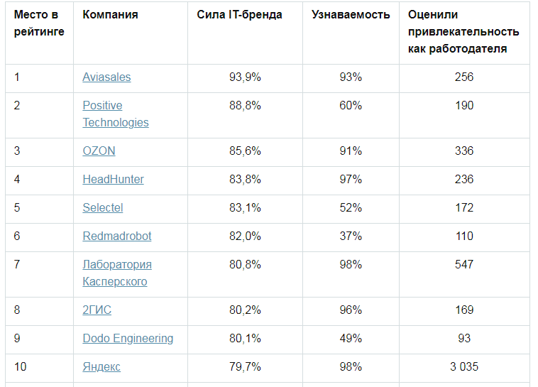 - Лидером рынка по силе IT-бренда оказалась компания Aviasales — это пример запоминающейся ситуативной коммуникации, рельефный и сильный IT-бренд с качественным B2C-брендом в качестве основы. Она стала хорошо узнаваема соискателями, и у них уже сформирован чёткий портрет компании с яркими характерными чертами.
