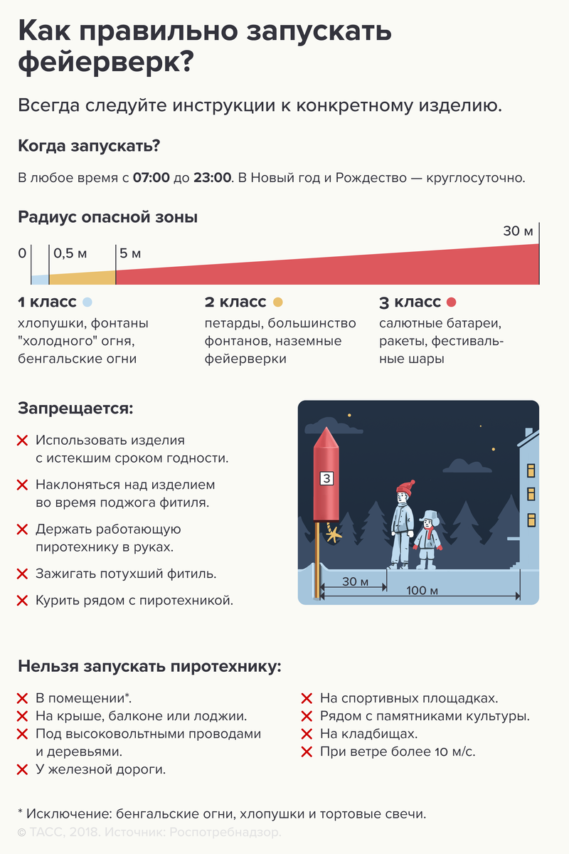 Чтобы запуск фейерверка прошел удачно, всегда следуйте инструкции к конкретному изделию. Важно соблюдать правила безопасности. Так, запрещается использовать фейерверк с истекшим сроком годности, держать работающую пиротехнику в руках или курить рядом. Нельзя наклоняться над изделием во время поджога фитиля и повторно зажигать его. Также необходимо правильно выбрать место для запуска. Например, салют нельзя запускать в помещении или на балконе, у железной дороги или на спортивной площадке, рядом с памятниками культуры и на кладбище. В зависимости от радиуса опасной зоны следует находится на определенном расстоянии от фейерверка. Если на упаковке указан первый класс опасности, безопасное расстояние составляет от 0,5 м, второй класс — от 5 м, третий — от 30 м.