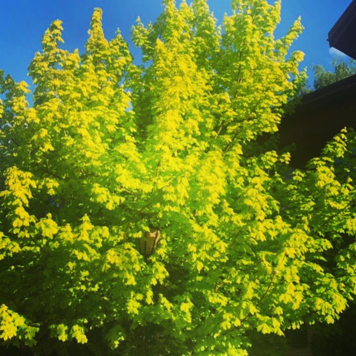 Клен остролистный Принцетон Голд (Princeton Gold) - Принцест голд Не могу не поделиться с вами красотой своего клёна Принцест Голд! Этот сорт пот распускании сразу становится ярко желтым. Затем, к началу лета листва зеленеет. Жёлтыми остаются лишь новые приросты. Он и осенью необыкновенно красив! Начинает краснеть с верхних веток, оставаясь зелёным снизу. Долго держит красивую листву и опадает после 20 октября, в то время как обычный клены уже к 5 октября начинают облетать. Еще, клён Принцест Голд отличается габитусом кроны от обычного клёна остролистного. Он очень широкий. Если вам нужно большое красивое эффектное дерево- посадите клён Принцест Голд!