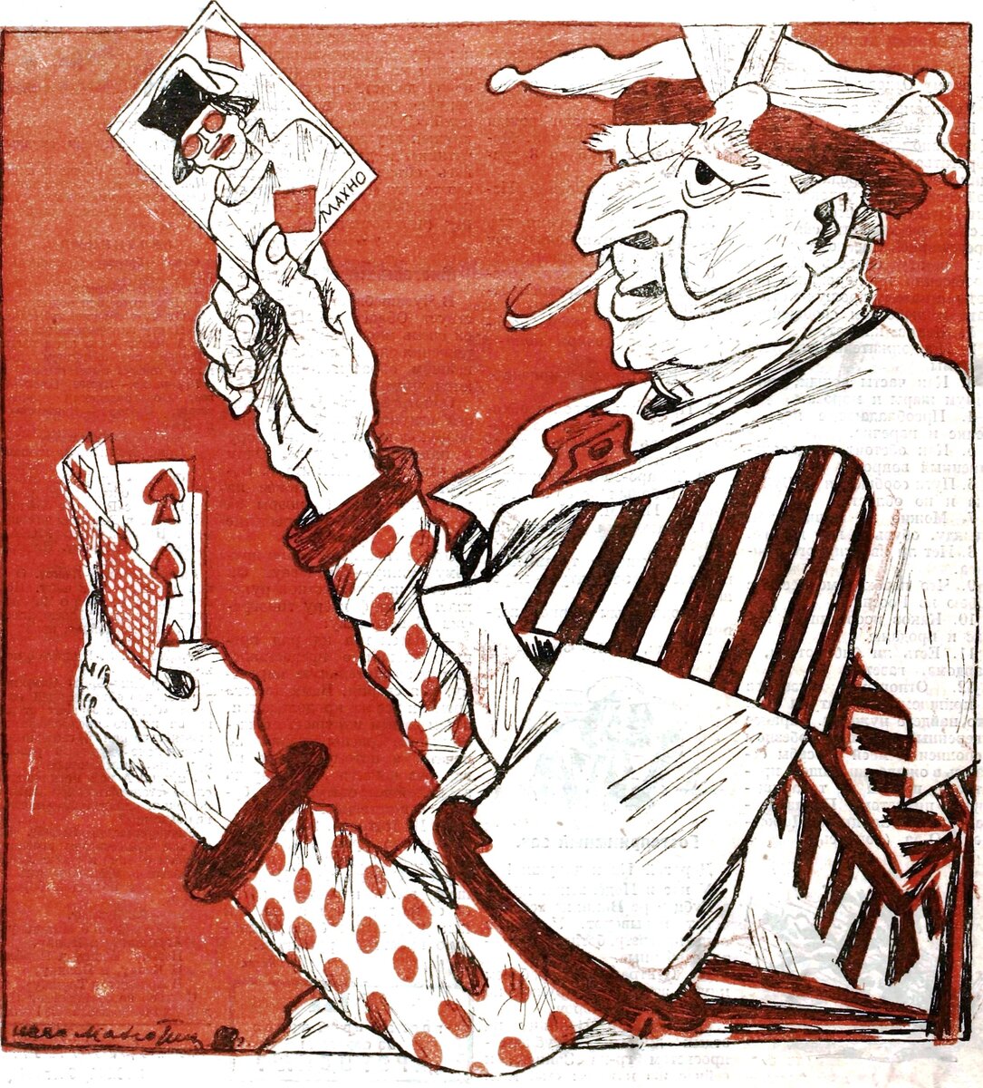 И еще одни "бывшие", но другие. Карикатура Ивана Малютина "Игра "в свои козыри" напоминает о "социалистически близких", но политически отдалившихся деятелях недавней Гражданской войны - анархисте Махно и эсере Савинкове. "Защищая Махно, польские адвокаты указывали, что Махно нужен правительству на случай войны с СССР: «Мы лишились такого козыря, как Савинков; пусть останется хоть Махно»". Подпись весьма лаконична: "Польша открыла свои карты...". Речь, разумеется, идет о показательном процессе в Варшаве, где на скамье подсудимых оказались сам легендарный "батька" Нестор Иванович Махно, его вторая жена - учительница, украинская националистка и анархистка Агафья (Галина) Андреевна Кузьменко (вот она на портрете художника В. Н. Гагенмейстера в 1919 году) ее будущий любовник, знаменитый атаман по кличке "Черна хмара" ("Черная туча"), при рождении названный Иваном Евдокимовичем Марковым и в Гражданскую дрейфовавший по маршруту "петлюровец-врангелевец-махновец". Четвертым был известный соратн
