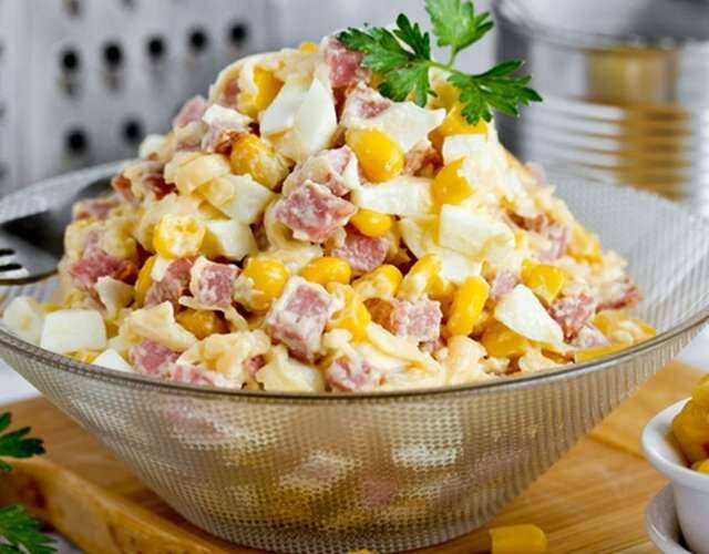 📖 Ингредиенты: - Копченая колбаса - 100 г. - Твердый сыр - 100 г. - Яйцо отварное - 3 шт. - Кукуруза - 0,5 банки - Майонез - по вкусу - Соль, перец - по вкусу 🧑🏻🍳 Приготовление: 1. Яйца, колбасу нарезать одинаковым не крупным кубиком. Сыр натереть на терке. 2. В глубокой чаше смешать все ингредиенты и заправить майонезом. При желании посолить и поперчить. Приятного аппетита!