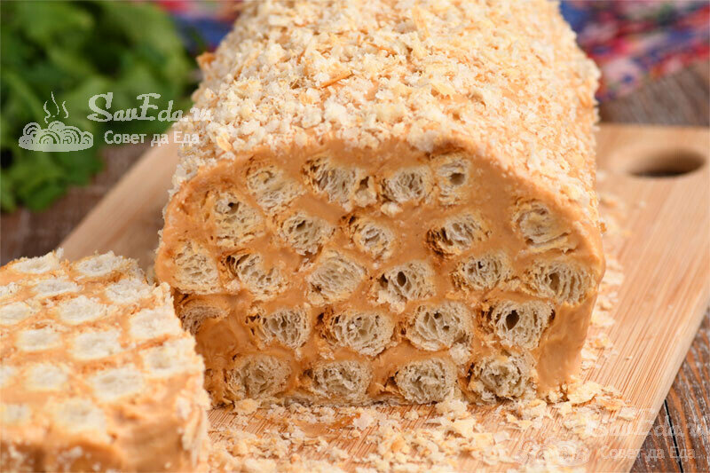 8. Оставшиеся 2 палочки из теста измельчаем и половину высыпаем на доску или тарелку. Торт освобождаем от пленки, перекладываем на доску и выравниваем крем ножом. Посыпаем сверху крошками и подаем на стол.