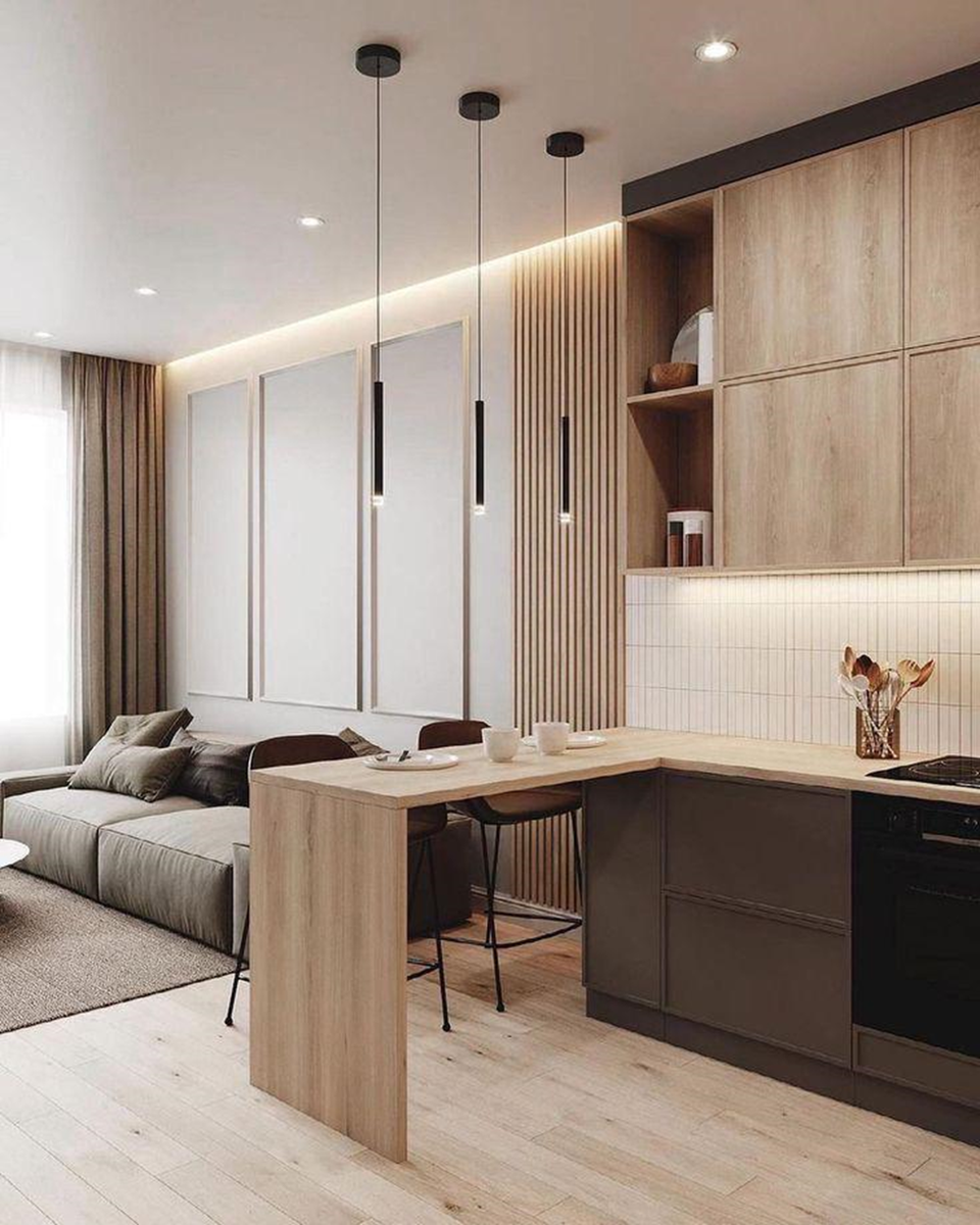 Почему сейчас предпочитают делать однокомнатные квартиры в формате студий? Все просто, однокомнатные квартиры редко отличаются большой площадью для действительно комфортного проживания, обычно это 25-40 КвМ, а открытая планировка позволяет визуально расширить пространство, не создает ощущение, что Вы находитесь в маленьких комнатушках, и в целом позволяет вместить больше зон в помещение. В этой статье мы разберем, какие основные приемы можно использовать, на что обратить внимание и про что ВАЖНО не забыть. ЗОНИРОВАНИЕ ПРОСТРАНСТВА Как бы хороша не была открытая планировка, без грамотного визуального зонирования у Вас не получится добиться комфорта в квартире. Я уже рассказывала в одной из статей, что человеческий мозг устроен так, что он привыкает делает определенные действия в определенном месте, т.е. в рабочей зоне Вы будете чуть более продуктивным, в обеденной же Вам будет хотеться что-нибудь перекусить и т.д. Для такого способа зонирования достаточно миксовки материалов: 2-3 вида н