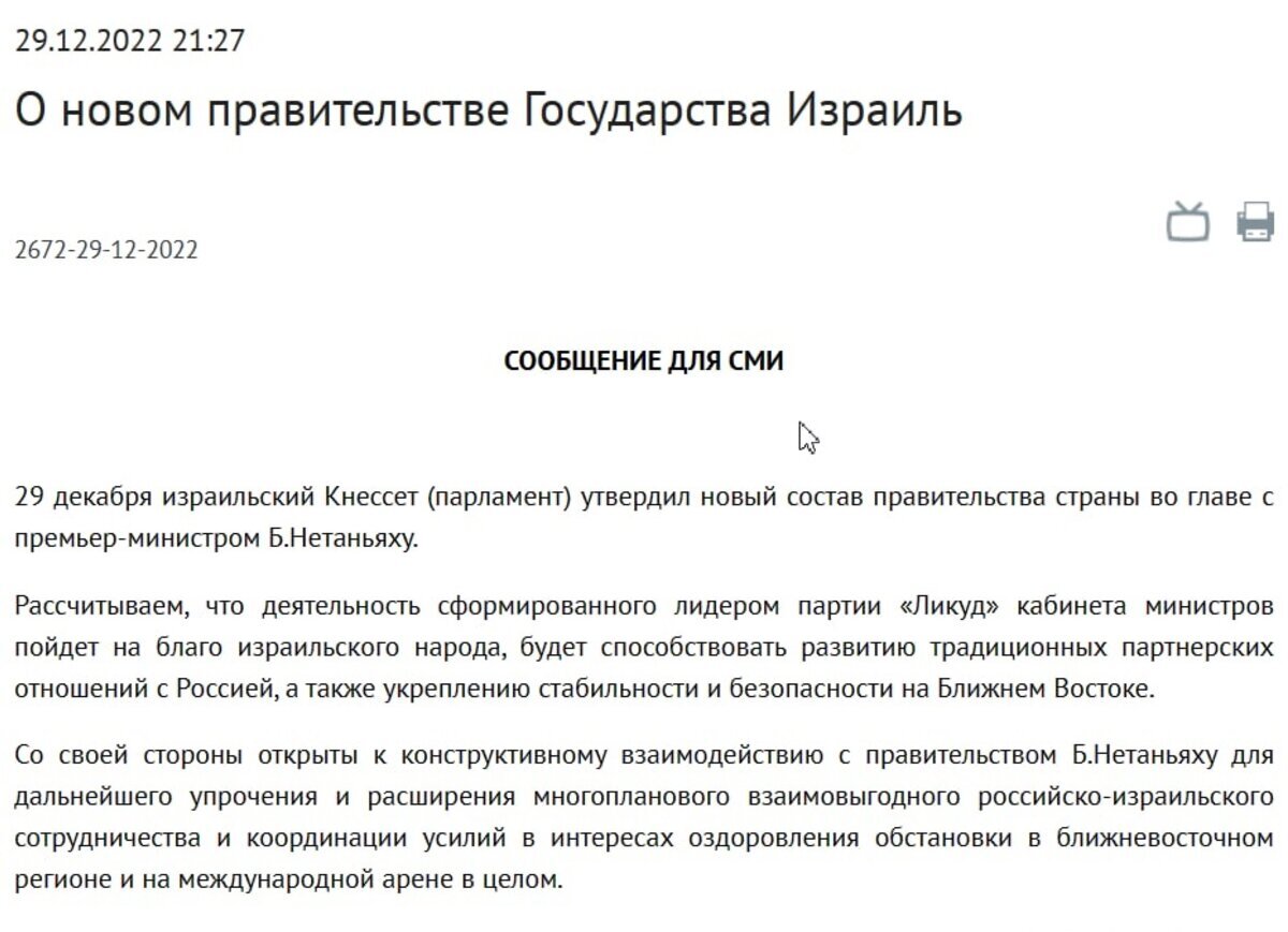 А также укрепление стабильности на Ближнем Востоке. В ведомстве заявили, что ожидают активного развития и укрепления отношений двух стран в связи с формированием нового правительства во главе с Биньямином Нетаньяху. Также в МИД РФ подчеркнули, что Россия готова к конструктивному сотрудничеству и укреплению традиционных партнерских отношений. Ранее президент России Владимир Путин поздравил с избранием на пост премьер-министра Биньямина Нетаньяху. Напомним, что позиция Израиля в контексте конфликта на Украине вызывает много вопросов на фоне неутихающих разговоров о возможных поставках вооружения для ВСУ. Ранее Readovka сообщала, что экс-премьер Израиля выступил против поставок оружия киевскому режиму.