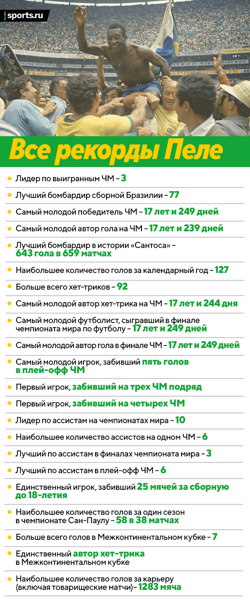Рекорды – важная часть величия Пеле. Мощный список: гегемония на чемпионатах мира по победам, ассистам и самым молодым голам. Есть и другие удивительные достижения – например, рекорды по голам за календарный год и хет-трикам за всю карьеру. • Всего Пеле забил невероятные 1283 гола! На самом деле 520 из них были в товарищеских матчах, и бразильца даже обвиняли в том, что он накрутил цифры в чемпионатах штатов и турнирах береговой охраны. • Пеле – лучший бомбардир в истории «Сантоса» (643 гола). До 2020-го бразилец держал рекорд по голам за один клуб, но Лео Месси отметил 644-й за «Барселону» и забрал себе новое достижение. Пеле тогда тепло поздравил аргентинца: «Увы, такие истории, как у нас с тобой, – истории долгой любви к одному и тому же клубу, будут встречаться все реже и реже. Я восхищаюсь тобой». • Пеле в официальных матчах забивал в среднем 0,92 гола за игру. В товарищеских играх – 0,94. Примерно равные цифры. • Пеле монструозно провел плей-офф чемпионата мира-1958, хотя ему был