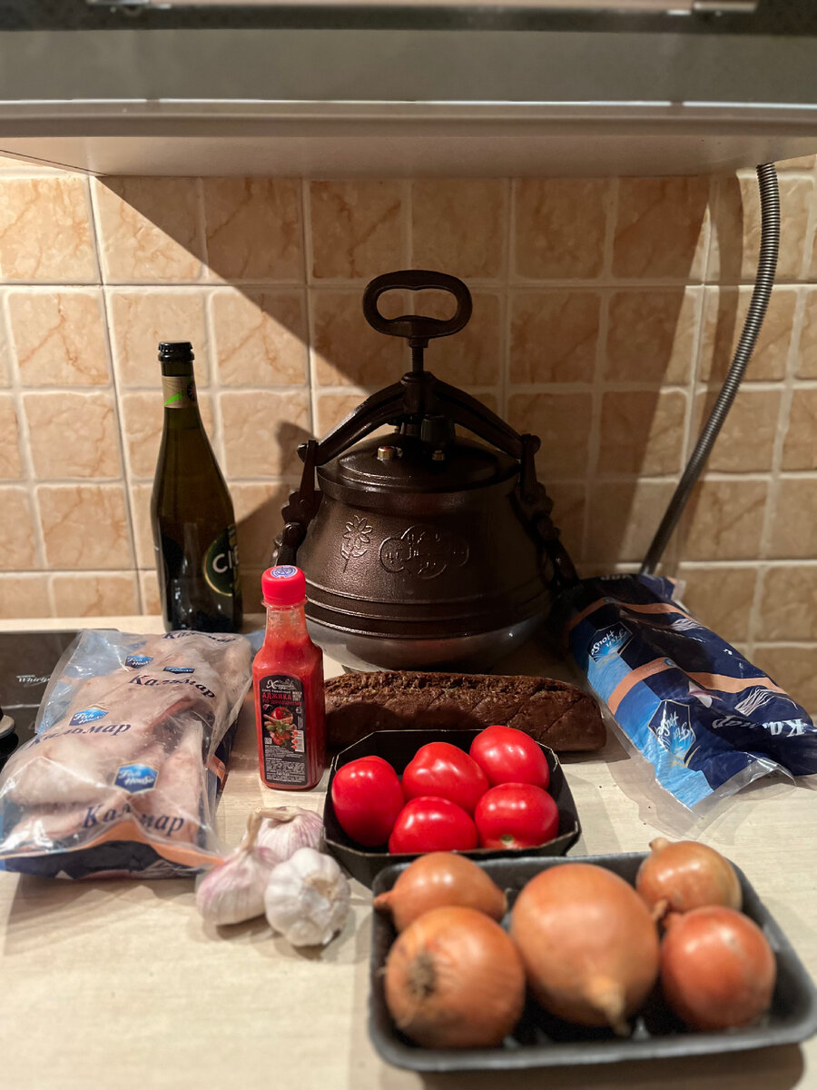 Сегодня я готовлю правильную еду или ПП. Если ты устал от индейки или куриной грудки - иди помассируй грудку или если ты нормальный мужик то скорее беги в пЕтёрочку и покупай там вкусных и только свеже пойманных и замороженных Кальмаров. Стоят кальмары не так дорого как силиконовая грудка, которую ты мог лежать и жамкать. Самое главное и первоочередное , что нужно купить в магазине это Сидр. Без него не один «Афганский казан» не будет готовить. Процесс выбора Сидра мы опустим, да и процесс покупки ингредиентов тоже . Зашел в магазин и покупай, что тебе нравится: 1. Сидр яблочный -1 штука 2. Заживо замороженные кальмары 2 упаковки если у тебя большой казан 3. Чеснок 3 шт. 4. Лук в количестве 5шт. Можно взять Ялтинский, но по мне не вежливо есть продукты вежливых людей и он сладкий 5. Помидоры Азербайджанские в количестве 5 шт. 6. Аджика по домашнему 7. Темный или белый хлеб с чесноком Сесть за стол или за матрац , открыть казан и можно употреблять руками или если тебя научи