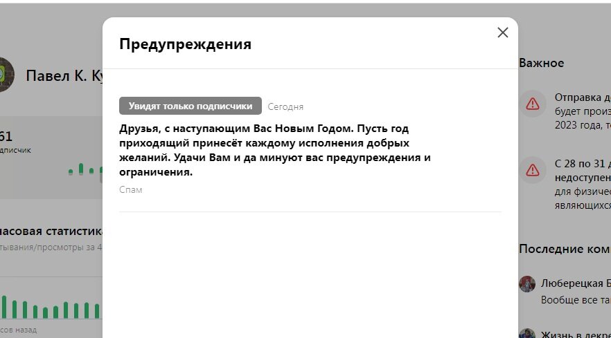 Среди ограничений, последних времен, чаще всего мне прилетает Спам. Но,за счет того что я проверяю предупреждения не только по утрам с телефона, но и через некоторое время после публикаций, вызывающих сомнения то ловлю их вовремя и сразу обращаюсь в ТП. Как проверить предупреждения с телефона я писал в статье Сегодня с утра словил очередной Спам Сегодня причиной Спама оказалось поздравление с Новым Годом, что логично,с точки зрения машинной логики. Все поздравляют,ничего нового,значит спам. Так же как руки в кадре Руки это тоже спам)) Написал в ТП, сразу,конечно Объяснил, хорошо что прислушались. Имели полное право отказать)) Спасибо им за оперативность. А Вас друзья, ещё раз С Новым Годом!! Проверяйте предупреждения после публикации поздравлений. И пусть минуют вас ограничения. Удачи! Подпишись, не убегай! За лайк и репост буду очень признателен.