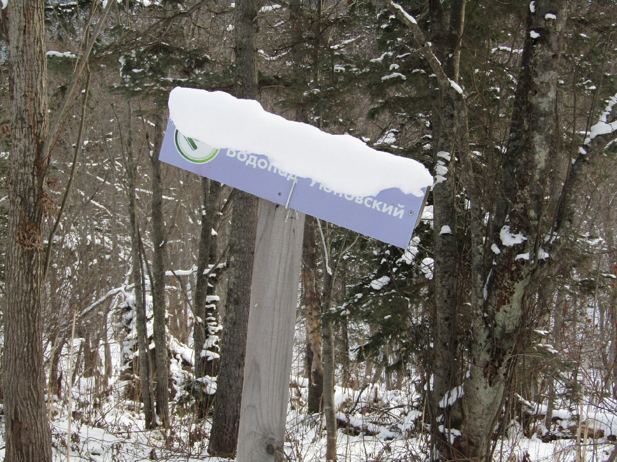 Поход к водопаду Уюновский стоит отнести к прогулке выходного дня. Путь к нему начинается в городской черте Южно-Сахалинска. Однако буквально через несколько сотен метров вы попадёте в дикую природу. И это здорово. В декабре это была наша уже вторая попытка побывать на природной достопримечательности. Первая случилась летом, но тогда мы струсили, увидев солидную кучку медвежьего помёта, а затем и следы хозяина тайги. Быстро ретировались в цивилизацию. На память о неудавшейся прогулке осталось знакомство с семейством неясытей. В декабре, по нашему мнению, все нормальные медведи уже спят сладким сном, а про ненормальных информации не было. И вот в один прекрасный день небольшой компанией собрались у остановки «Железнодорожная больница» и двинулись в путь. Снега пока ещё мало, больших сугробов нет. Перед нами кто-то уже прошёл по этой тропе, так что путь был намечен. Часть маршрута – вполне наезженная лесная дорога. По ней мы прошли около километра и с правой стороны увидели большую жел