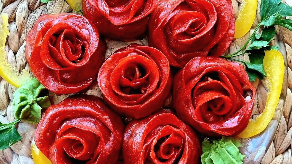 Ингредиенты Для теста : Мука 220г Соль 1 ч .л Свекла 1 шт Вода 70-80 мг Для начинки : Мясо 300г Лук 150 г ( 1,5 шт ) Внутренний говяжий жир 50 гр Растительное масло 40 гр Соль 1 ч.л Кумин 1ч.л Черный перец 1ч.л Паприка 1ч.л Приготовление : Шаг 1 Свеклу очистим и измельчим в блендере с водой . И через тряпочку выжмем сок из свекла Шаг 2 Смешиваем муку , свекольный сок и соль . Замесим гладкое и мягкое тесто . Завернем и оставим на 20 минут . Шаг 3 Для начинки мясо , лук и жир нарезаем маленькими кубиками , далее добавляем растительное масло , соль , приправы и очень хорошо перемешиваем . Шаг 4 Тесто раскатываем тонким слоем . Вырезаем с помощью стакана или формочки круги. Складываем 3-4 таких круга . По середине укладываем начинку и складываем пополам защипывая концы.. Затем сворачиваем в клубочек, придавая форму розочки. Шаг 5 Окунуть низ каждой розочки в растительном масле и выложить в лист мантоварки . Готовим на пару 30 минут. Подаем крас