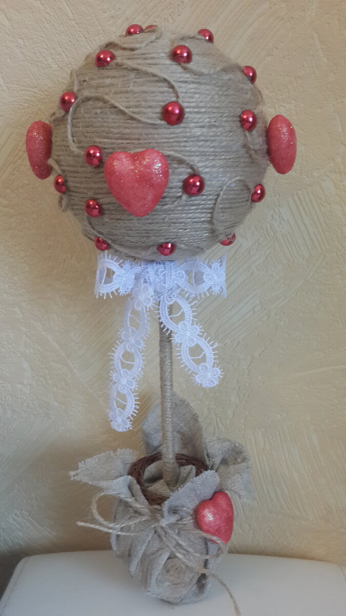 На фото представлен один из первых моих топиарий из джутовой нити, бусин и мешковины. Стиль у него романтический, был предназначен для новобрачных.