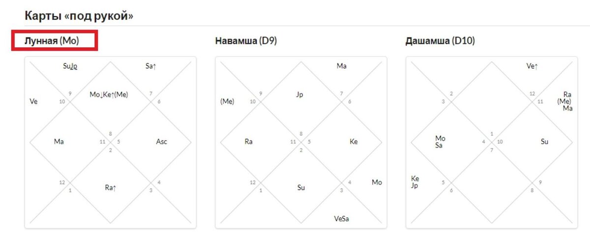 Для определения своего восходящего или лунного знака нам нужно посмотреть какая цифра стоит в первом доме - это верхний ромбик в основной, или в лунной карте, если ваше время рождения - не точное. Где именно смотрим этот “ромбик” - смотрите на примере: