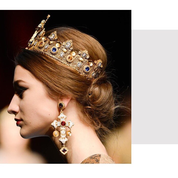 В нашей статье "А вы знали что такое микромозаика?", мы рассмотрели ювелирные изделия, выполненные с применением техники микромозаики. Сегодня мы рассмотрим коллекцию Dolce & Gabbana, посвящённую Византии, и разберёмся чем же она интересна. Напомним, что Dolce & Gabbana- это достаточно молодой итальянский дом мод, основанный в 1984 году. Отличительная особенность бренда- поражающие роскошью и блеском коллекции на итальянскую тему. Мозаика При просмотре коллекции в глаза бросаются невероятные принты, отражающие византийскую мозаику в традиционных оттенках (охра, голубой, бордовый, светло-коричневый, бледно-зеленый). Усиливают эффект пришитые камни различных огранок и цветов. Рассмотрим поближе детали Кресты Золотые серьги и подвески, выполненные в виде крестов, поражают своими размерами и сложностью. Присмотревшись к изделиям можно заметить, что выполнены они в техники филигрань, достаточно известной в русском ювелирном искусстве. Некоторые вставки выполнены из Муранского стекла. Ко