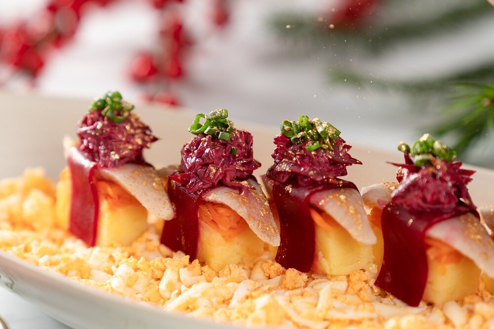 - До 8 января в ресторане Yura собрали все новогодние хиты. Тут и два вида "Оливье" (от 690 р.), и олюторская сельдь (790 р.), и сало с горчицей (530 р.). В общем, остается только выбрать вечер и определиться — водка или игристое.