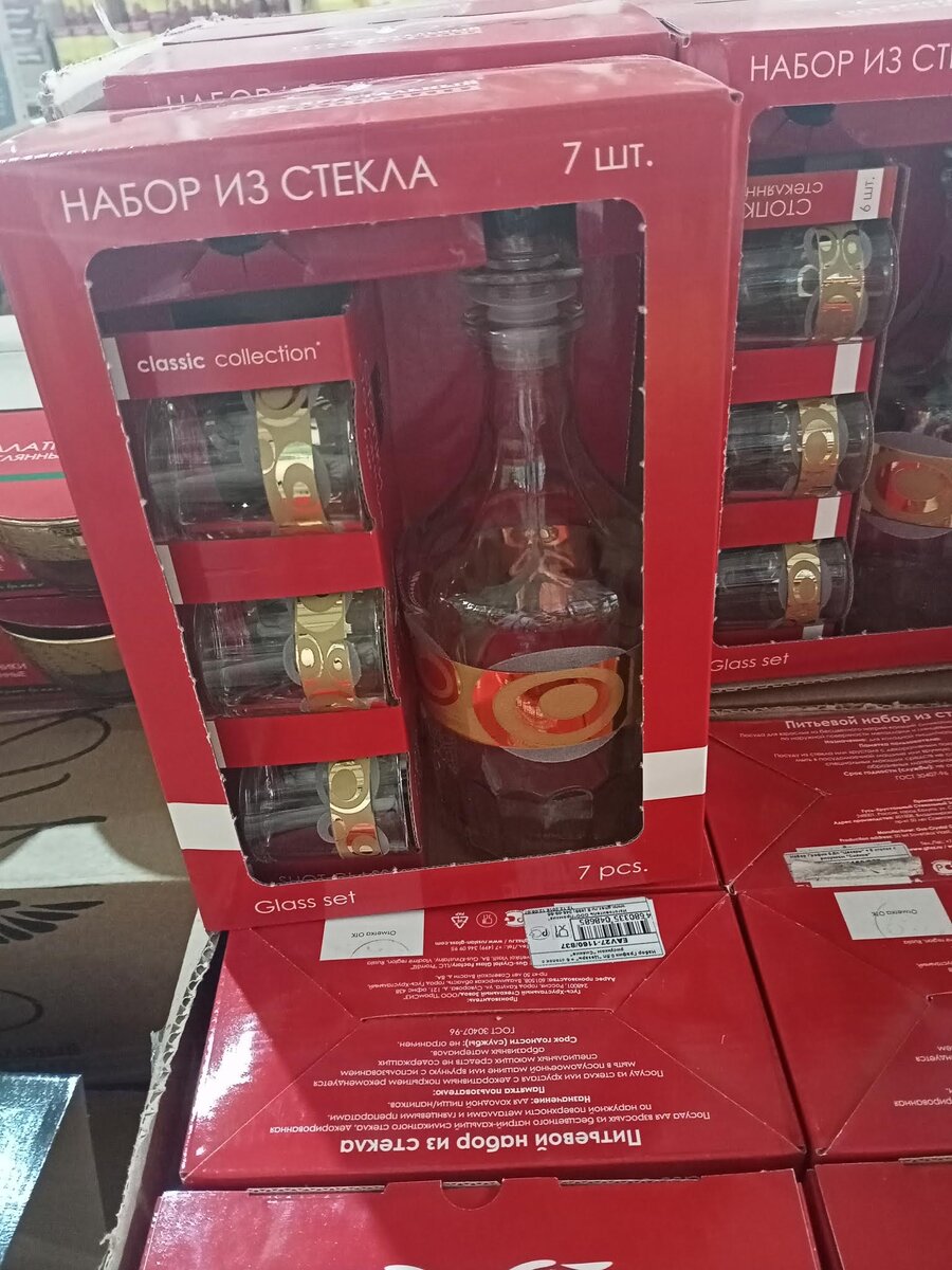 Приветствую вас, дорогие подписчики и гости моего канала. Поздравляю вас с наступающим Новым Годом, пусть он будет лучше уходящего и принесет нам мир, стабильность и уверенность в завтрашнем дне. Сегодня вновь мой рассказ будет посвящен любимому Светофору, его товарам и ценам. Итак, давайте смотреть, что новенького появилось перед праздниками. В продаже появились такие питьевые наборы из стекла. Производитель Гусь-Хрустальный стекольный завод, Россия. Набор состоит из графина и 6 стопок, стоит 419.90. Набор очень классно смотрится и цена выгодная, люди брали по несколько штук, видимо на подарки:)) А эти наборы чуть подороже, но и содержание поинтересней. Производитель все тот же Гусь-Хрустальный стекольный завод, Россия. В набор входит 6 стопок и 6 фужеров. Расцветки в наличии 2: лоза и греческие узоры. Стоимость набора составляет 839.90. Появились недорогие салатники Atlantis в красивых подарочных коробках. Производитель Pasabahce. Диаметр салатника 27 см, цена 145.90. Около этого то