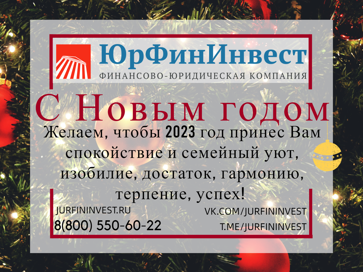 Поздравляем клиентов, партнеров и всех остальных друзей компании «ЮрФинИнвест» с наступающим Новым годом! Пусть в 2023 году у каждого появится возможность развить свое дело! Пусть каждый получит шанс утроить свои доходы и получить профессиональное признание! А в развитии бизнеса Вам, как всегда, готовы помочь специалисты нашей компании! https://jurfininvest.ru/news/pozdravlyaem-s-nastupayushhim-novym-godom-uspehov-v-2023/ Новый год – новые возможности! Это не просто слова, а девиз нашей компании, которым мы готовы поделится с каждым! Встретимся в 2023 году, чтобы продолжить сотрудничать. А пока Вы празднуете и отдыхаете, мы остаемся на страже Вашего бизнеса. Наши специалисты внимательно следят за изменениями, происходящими в мире и правовом поле России. Наши юристы изучают все законодательные новшества. Мы готовы к переменам в лицензировании, сертификации и аккредитации отечественных предпринимателей. Доверьтесь нам, чтобы не переживать о новых процессуальных нормах и лицензионных треб
