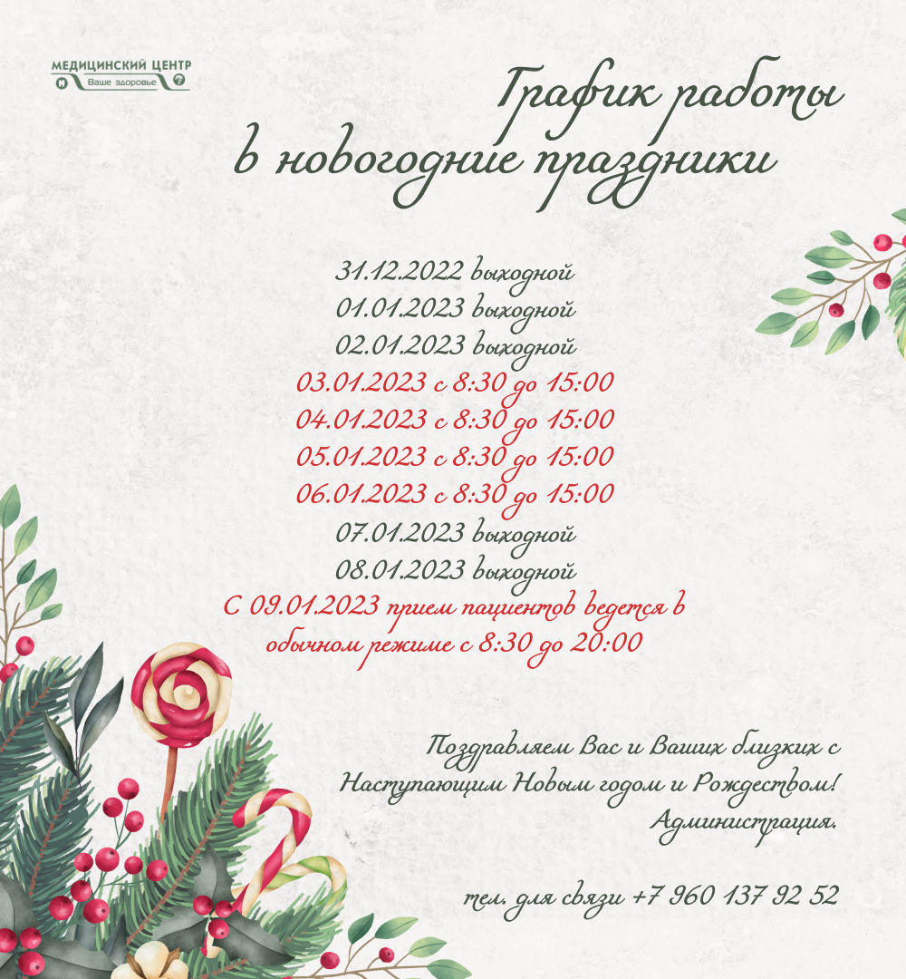 Дорогие друзья!Сердечно поздравляем вас с наступающим Новым 2023 годом!А заодно сообщаем, как работает наш медицинский центр в Новогодние праздники.