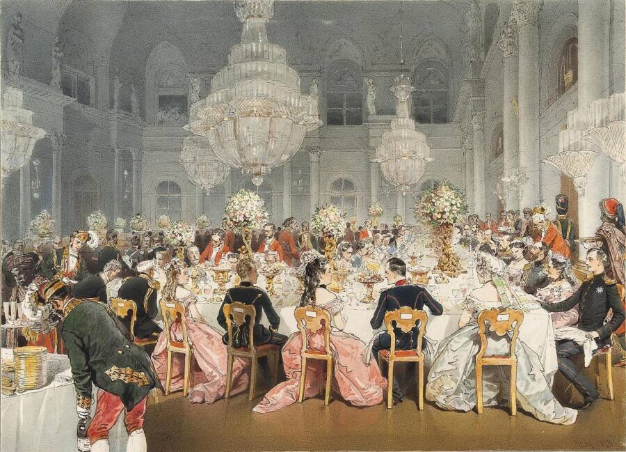Схожий набор блюд подали гостям и по случаю венчания на царство Николая II. На банкете перед каждым приглашенным лежал свиток, развернув который, можно было увидеть написанный старославянской вязью список яств. Оформлением меню занимался прославленный художник Василий Васнецов. На обед гостям предлагалось отведать следующие блюда: суп-рассольник, борщок, пирожки, стерляди паровые, барашек, заливное из фазанов, каплуны (мясо специально откормленного петуха), салат из спаржи, а на сладкое – мороженое и фрукты в вине.