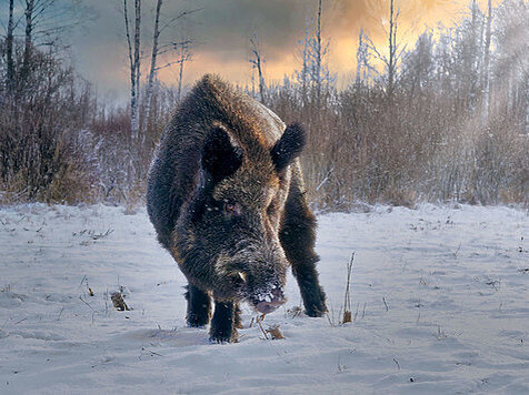 При мне было ружье, заряженное картечью на волка. Я снял лыжи и стал обходить ельник, желая увидеть кабана и определить его ранение. В лесу снегу навалило выше колен, наст не держал, поэтому идти было тяжело.