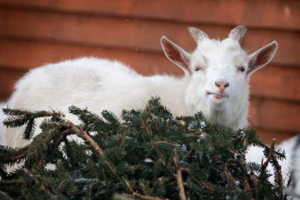 Новогодняя елка козам Разновидности ели, сосны вместе с пихтами Фрейзера или Дугласа – все это в преддверии нового года называют «рождественские деревья» и все они безопасны для коз за исключением очень токсичного тиса. Если договориться с организаторами елочных базаров или тех, кто принимает на переработку новогодние елки, можно получить и корм, и деревянную мега-расческу на весну. Многие из популярных хвойных, отобранных в качестве новогодних елок, можно использовать в качестве пищевой добавки для коз в ограниченных количествах, придерживаясь принципа разумности. То есть, ветки не должны заменять обычный корм. Козы будут есть иглы, грызть ветки и кору. Разумеется, всю мишуру следует снять. Сосновые иглы особенно полезны: содержат микроэлементы, антиоксиданты и минералы и корм, витамины А и С. Сосна хороша для борьбы с внутренними паразитами и служит хорошим разнообразием в скучной зимней диете из сена. Эфирные масла хвойных могут помочь стимулировать пищеварительную деятельность